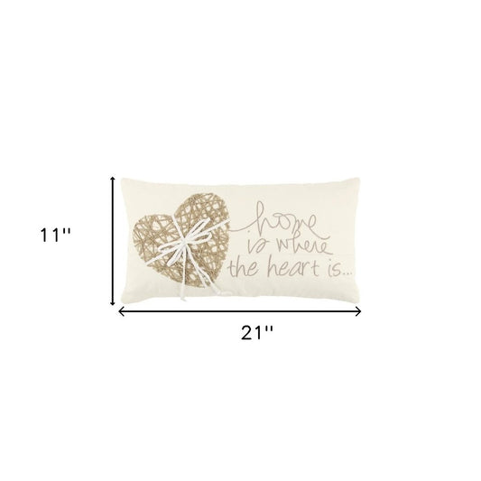 11" X 21" Ivory Home is Where the Heart Is Throw Pillow With Embroidery