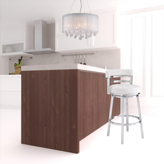 26" White And Silver Faux Leather And Iron Swivel Low Back Counter Height Bar Chair