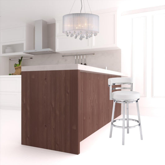 30" White and Silver Faux Leather and Iron Low Back Bar Height Swivel Bar Chair