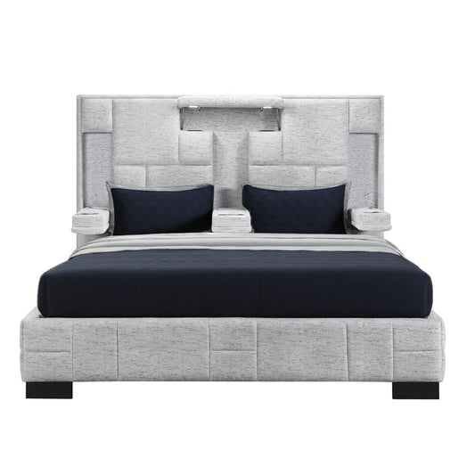 White and Light Gray Ribbed Texture Wood And Upholstery Lighted Queen Bed Frame