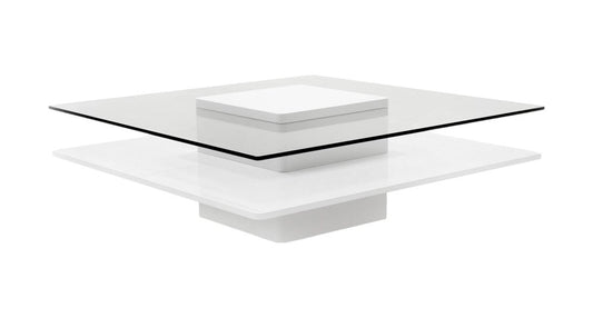 39" Clear and White Glass And Wood Square Pedestal Coffee Table With Shelf