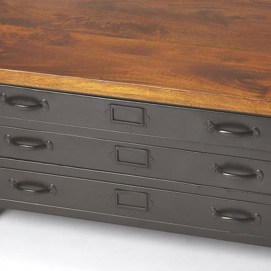 36" Brown and Gray Solid Wood and Metal Square Coffee Table With Three Drawers