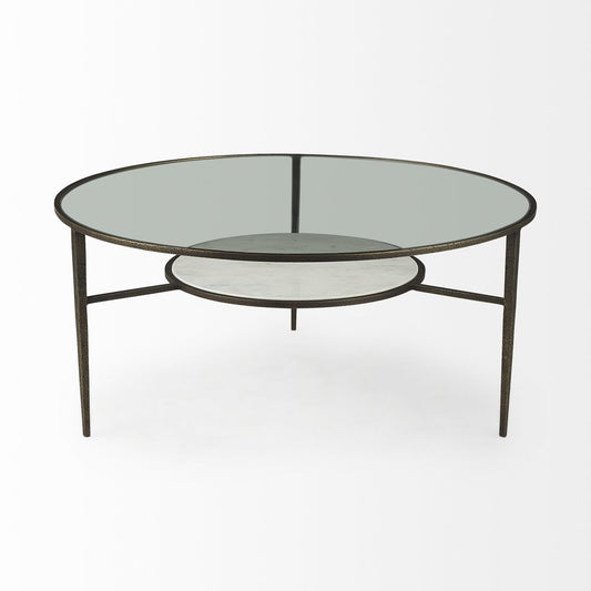 36" Clear and Bronze Glass and Metal Round Coffee Table With Shelf