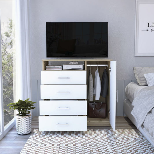 36" White and Natural Four Drawer Combo Dresser With Open Shelf