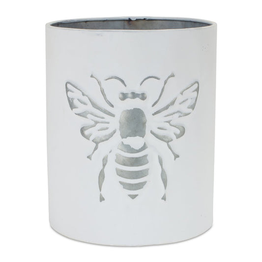 Set of Three White And Gray Metal 9 Ounce Abstract Round Distressed Pot Planters