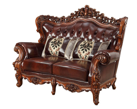 69" Brown And Walnut Top Grain Leather Curved Loveseat and Toss Pillows