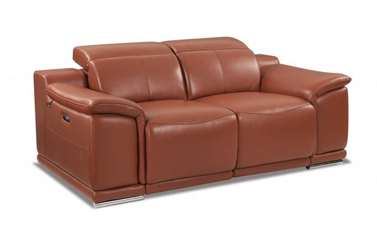 72" Camel And Silver Italian Leather Power Reclining Loveseat