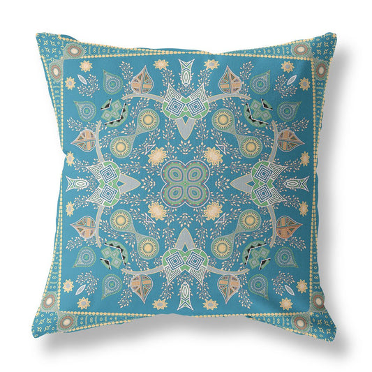 16" X 16" Aqua And Gold Blown Seam Floral Indoor Outdoor Throw Pillow