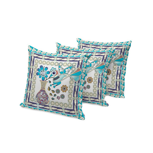 Set of Three 16" X 16" Blue and Purple Peacock Blown Seam Floral Indoor Outdoor Throw Pillow