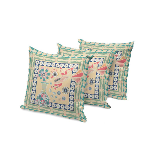 Set of Three 16" X 16" Green and Pink Peacock Blown Seam Floral Indoor Outdoor Throw Pillow