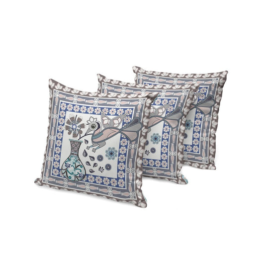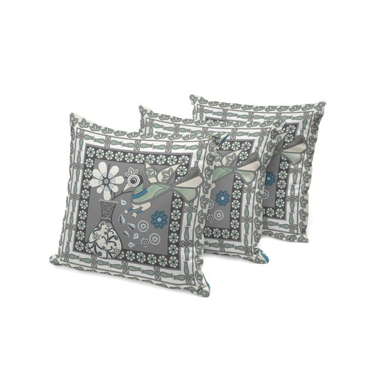 Set of Three 16" X 16" Beige and Gray Peacock Blown Seam Floral Indoor Outdoor Throw Pillow