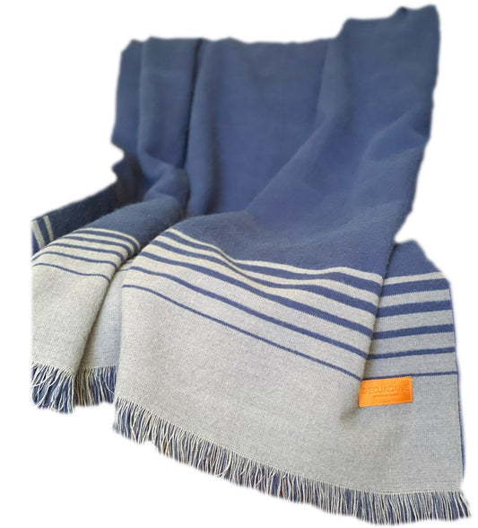 Blue and Gray Woven Microfiber Striped Throw Blanket with Fringe