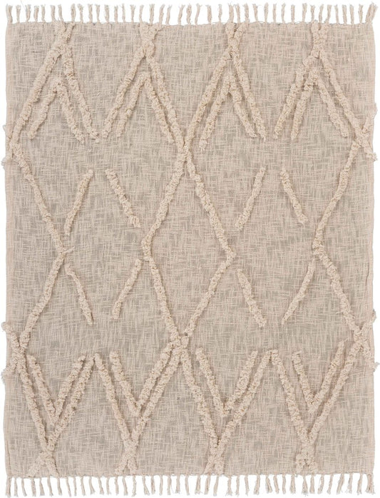 60" X 50" Beige Woven Cotton Geometric Throw Blanket with Fringe