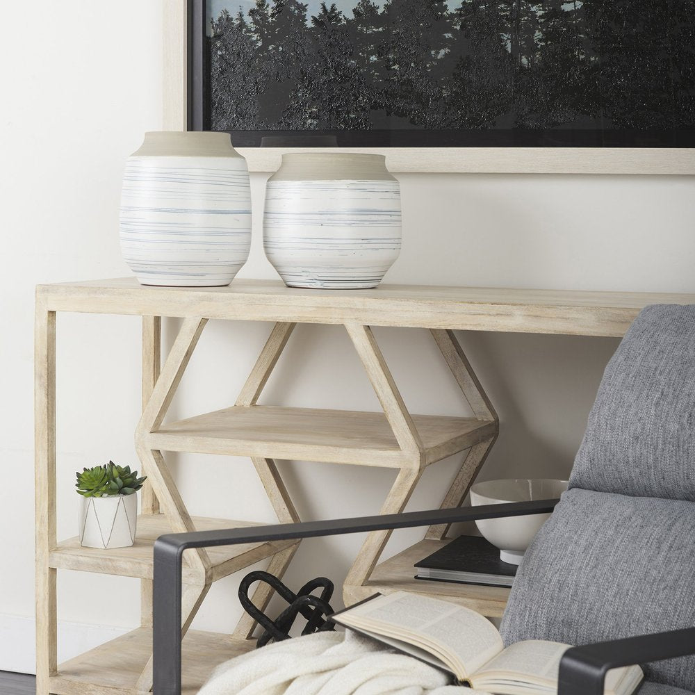 Elevate your space with this stunning 10-inch blue sand and white abstract cylinder ceramic table vase. The modern design and stylish color combination make it a perfect choice to add a touch of sophistication to any room. Created with a coat/paint distressing technique, this vase exudes a unique charm that will complement your existing decor effortlessly. The cylindrical shape adds a contemporary flair, making it a versatile piece that can stand alone or be used to display your favorite flowers or foliage. Crafted from high-quality ceramic material, this vase is not only durable but also adds a sleek and polished look to your space. 10-inch h x 9-inch w x 9-inch d.