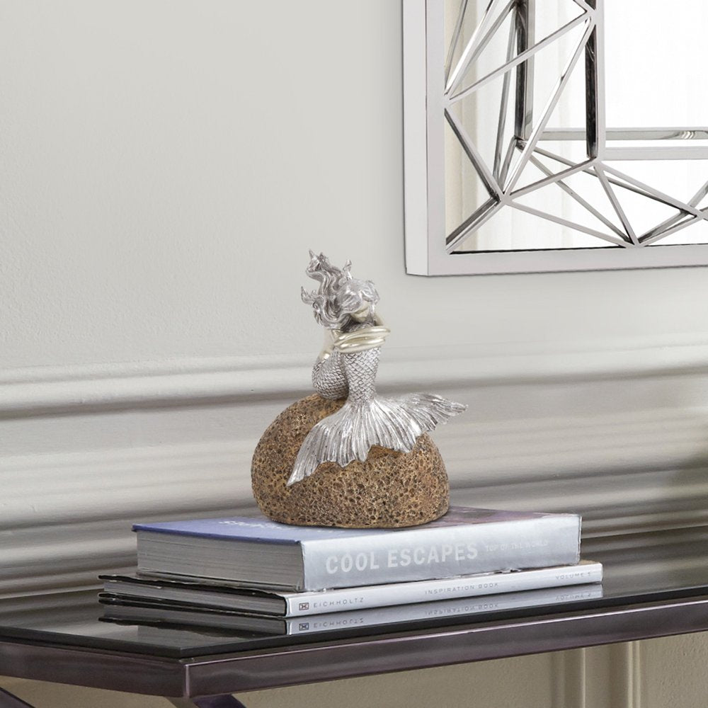 Bring some sizzle to your space with this eye-catching 10-inch brown and silver contemplative mermaid resin tabletop sculpture. Finished with great texture and detailing, the rock is a realistic stone color while the mermaid is finished in a silver with black rubbed distressing and highlights. Capture the spirit of this lovely siren of the sea with this unique coastal tabletop sculpture. 10-inch H x 8-inch W x 5-inch D