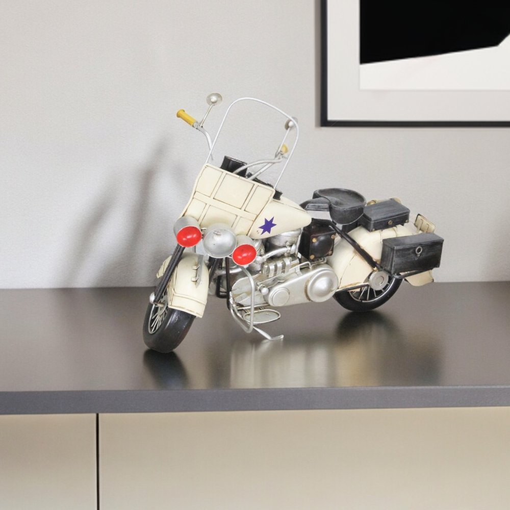 Unique and decorative, this 10-inch cream metal hand painted early 1900-foots police motorcycle model model motorcycle will leave a lasting impression. The cream coloring of this high quality metal accent will look great in most any space. A perfect decorative addition for anyone who loves a stylish look and feel. 9.5-inch h x 16.5-inch w x 5.5-inch d.