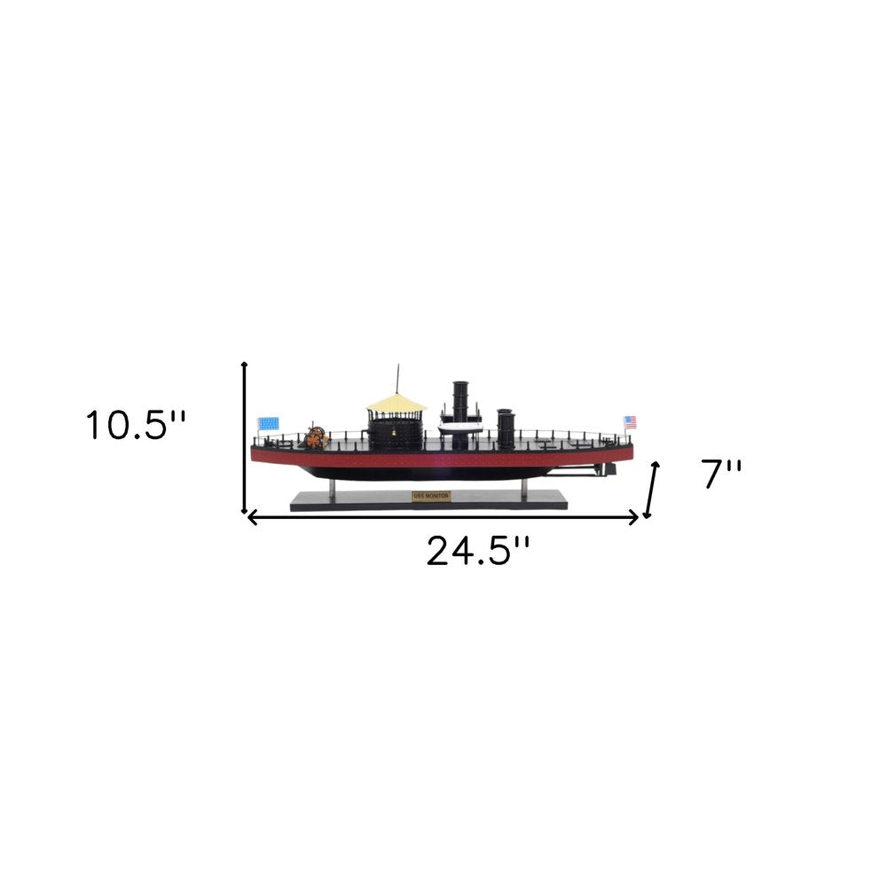 The 11-inch black and red solid wood hand painted 1862 uss monitor model boat is the perfect decorative accessory for your home. This black and red colored piece is made from high grade solid wood. This replica makes a great tabletop accent for your coffee table, desk, bookshelf, dresser or mantle. A perfect decorative addition for anyone who loves nostalgia and vintage style models and replicas. It's a perfect addition for those who love an up-to-the-minute look and feel. 10.5-inch h x 24.5-inch w x 7-inch d.
