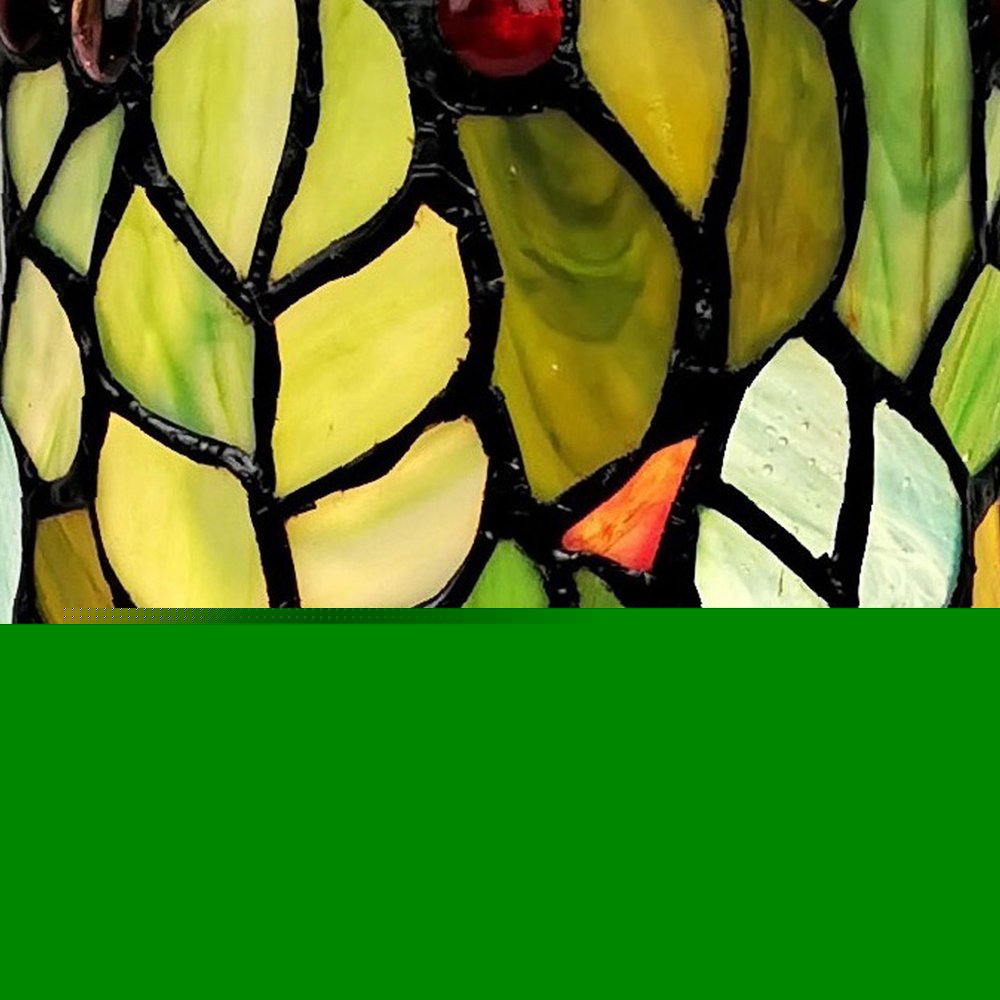 Add some warm light and classic beauty to your space with this 10.5" leaves and berries stained glass accent table lamp. Hand-crafted with the same techniques used by the original Tiffany lamp makers, the multi-colored pieces of glass for this cylindrical piece are fused together to create a lamp that is also a colorful piece of art. Glass is hand cut to the perfect shape and size, wrapped in copper foil, and soldered together to create this stained glass beauty. Sitting atop a round resin base, this mini lamp is ideal for end table, desk, nightstand, or mantle. 10.5-inch H x 5-inch W x 5-inch D