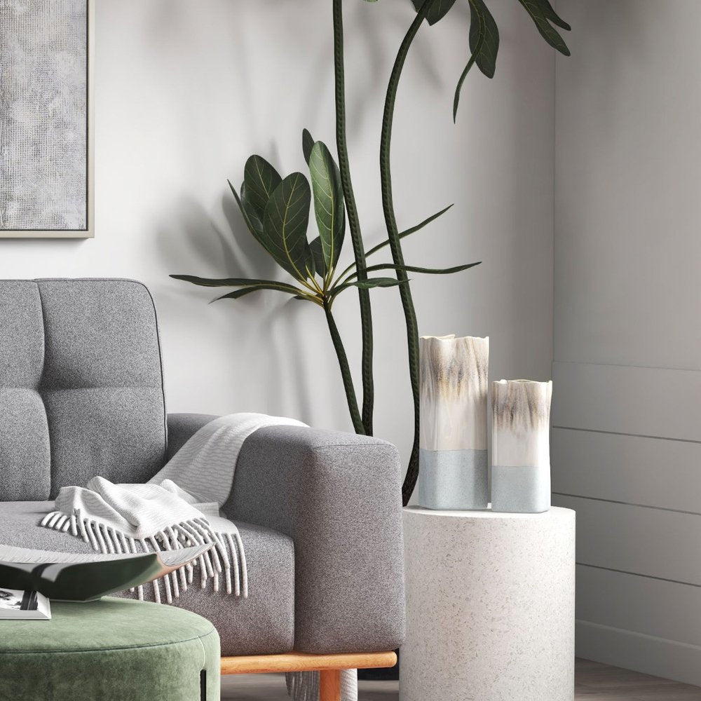 The 12-inch brown light blue and off white color block square ceramic table vase is a striking addition to any home decor. Crafted from high-quality ceramic, this vase showcases a unique square shape that offers a contemporary touch. Its purposeful distressing adds character, making it an eye-catching centerpiece for your table. The harmonious blend of brown, light blue, and off white colors enhances its modern style, allowing it to complement various interior aesthetics seamlessly. This versatile piece is perfect for displaying fresh or dried flowers, elevating your living space with a blend of elegance and charm. Embrace the beauty of this decorative vase as it transforms your home into a stylish sanctuary. 12-inch h x 5-inch w x 4-inch d.