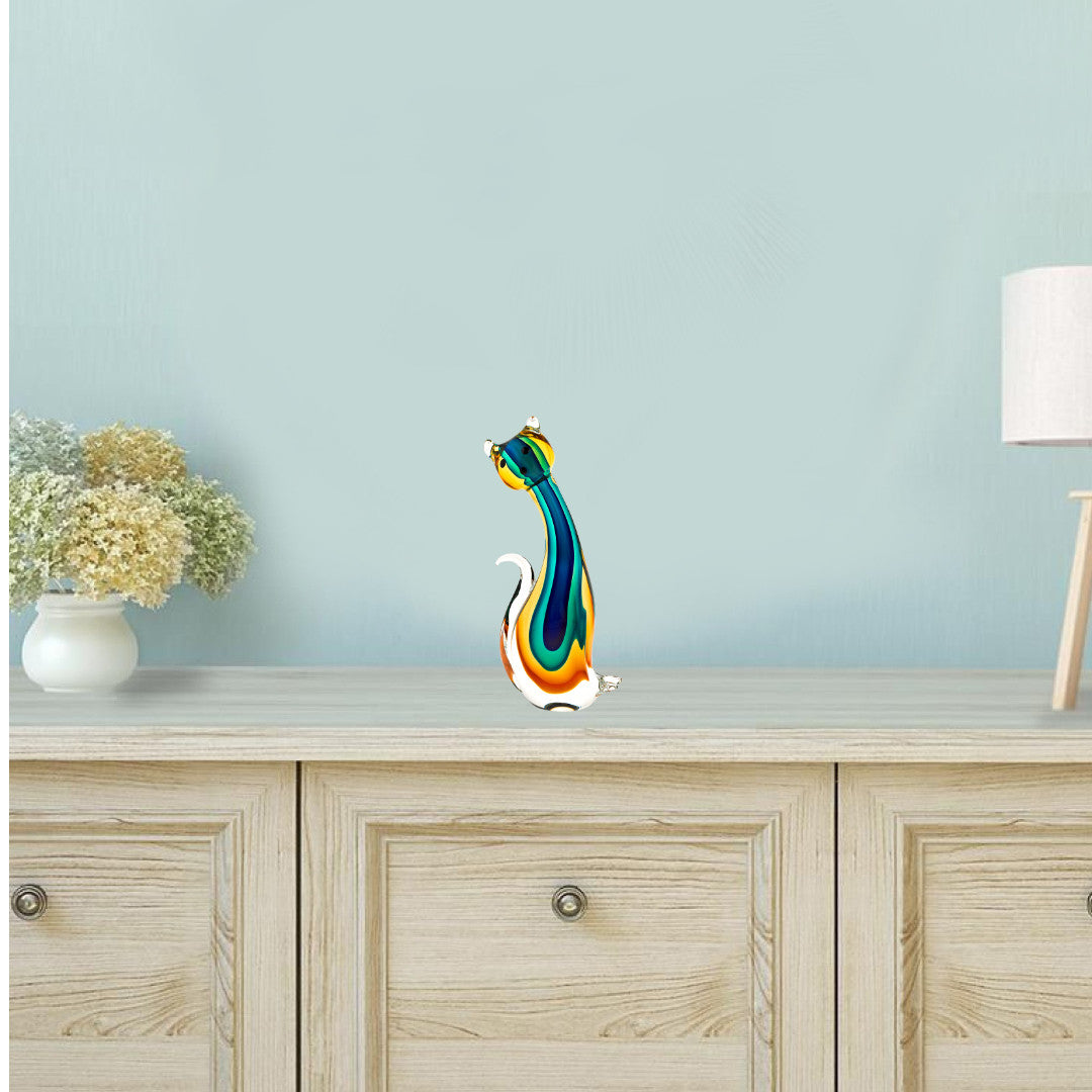 Unique and decorative, this 12-inch clear yellow green black murano glass cat figurine tabletop sculpture will leave a lasting impression. High-quality murano glass used in this clear yellow green black sculpture is both good looking and hard wearing. Decorate your space and evoke memories of your favorite feline with this good looking cat accent piece. It's a perfect addition for those who love an up-to-the-minute look and feel. 12-inch H x 3-inch W x 6-inch D