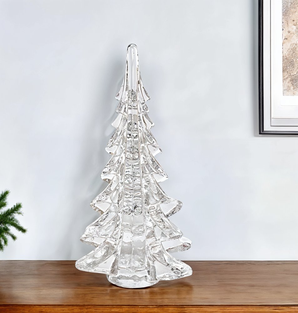 This 12-inch mouth blown clear glass Christmas tree sculpture will add a beautiful decorative accent to your decor. Bring a touch of elegance and festive holiday style into your home with this charming glass tree sculpture. Hand-crafted in the Murano art glass style, this high grade mouth blown glass tree will be a great addition to your holiday decor or make a wonderful gift. A classic and classy way to decorate for the holiday. 12-inch H x 6-inch W x 6-inch D