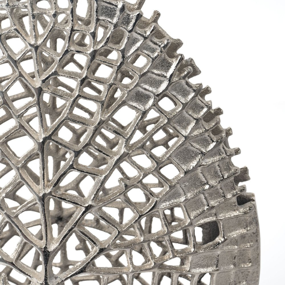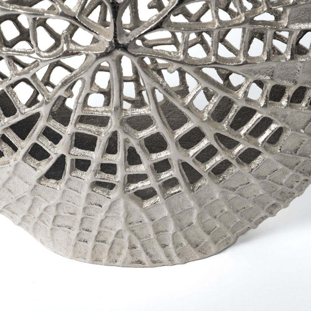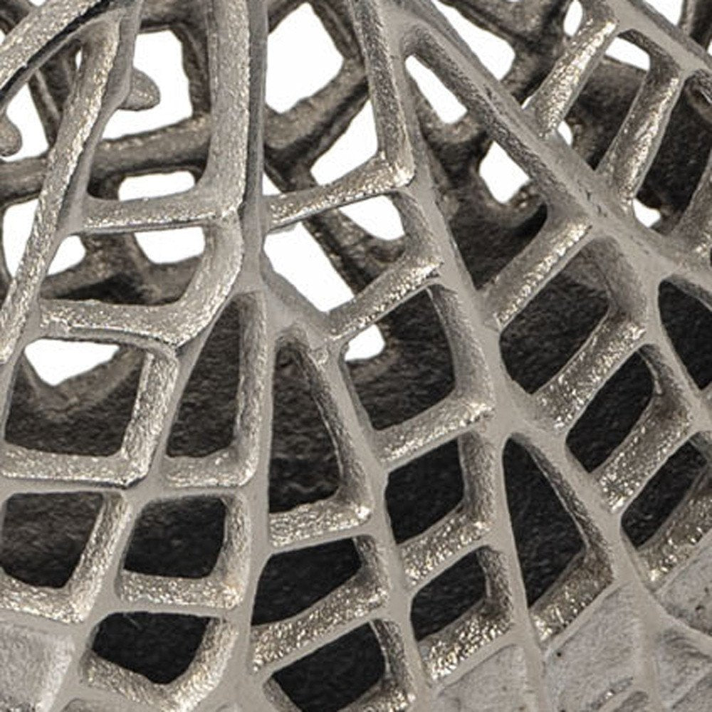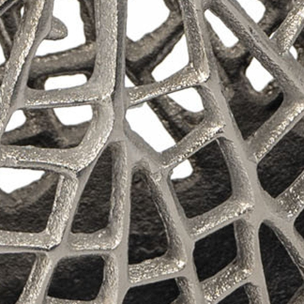 The 14-inch silver pierced aluminum table vase adds a striking modern touch to your decor. Crafted from high-quality cast aluminum, this vase showcases a purposeful distressed metal finish that enhances its aesthetic appeal. The shimmering silver color features a pierced modern abstract design that beautifully reflects light, creating an eye-catching centerpiece for any table setting. Its unique pierced design allows for creative floral arrangements or can be left empty to serve as a sculptural element. This table vase is perfect for those looking to elevate their home with chic, contemporary decor. Embrace the blend of form and function with this stylish addition to your living space. 14-inch h x 11-inch w x 5-inch d.