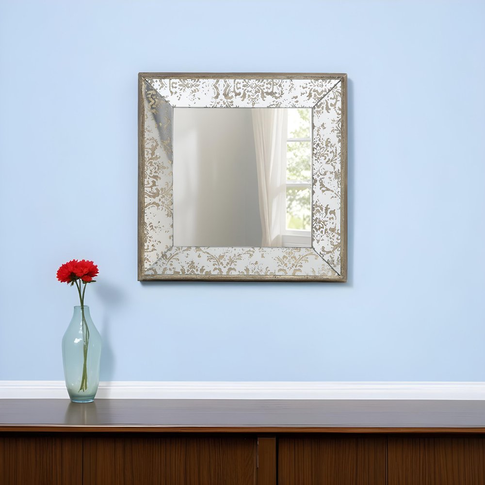 The elegantly crafted 15-inch brown square framed antiqued damask accent mirror is what you need to add finishing touch to your decor. The antiqued glass finish frame features a distressed damask print that gives this piece vintage charm. This mirror will not only be a great practical addition to any location of your home but will also help elevate the space in the room. 15.2-inch H x 15.2-inch W x 2-inch D