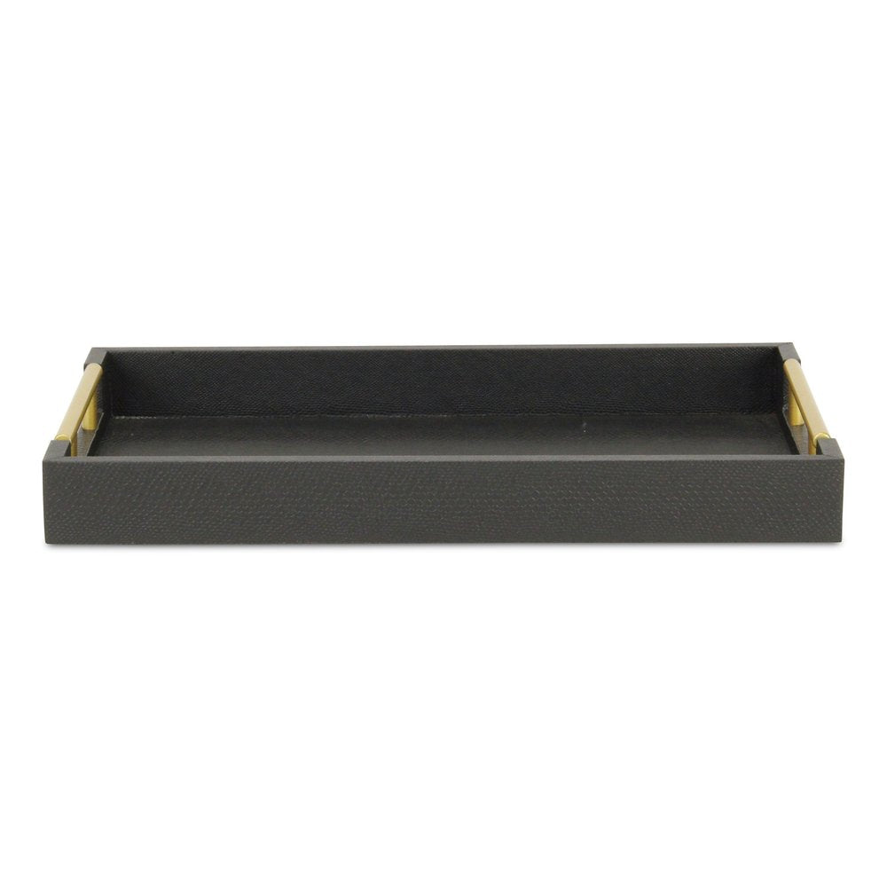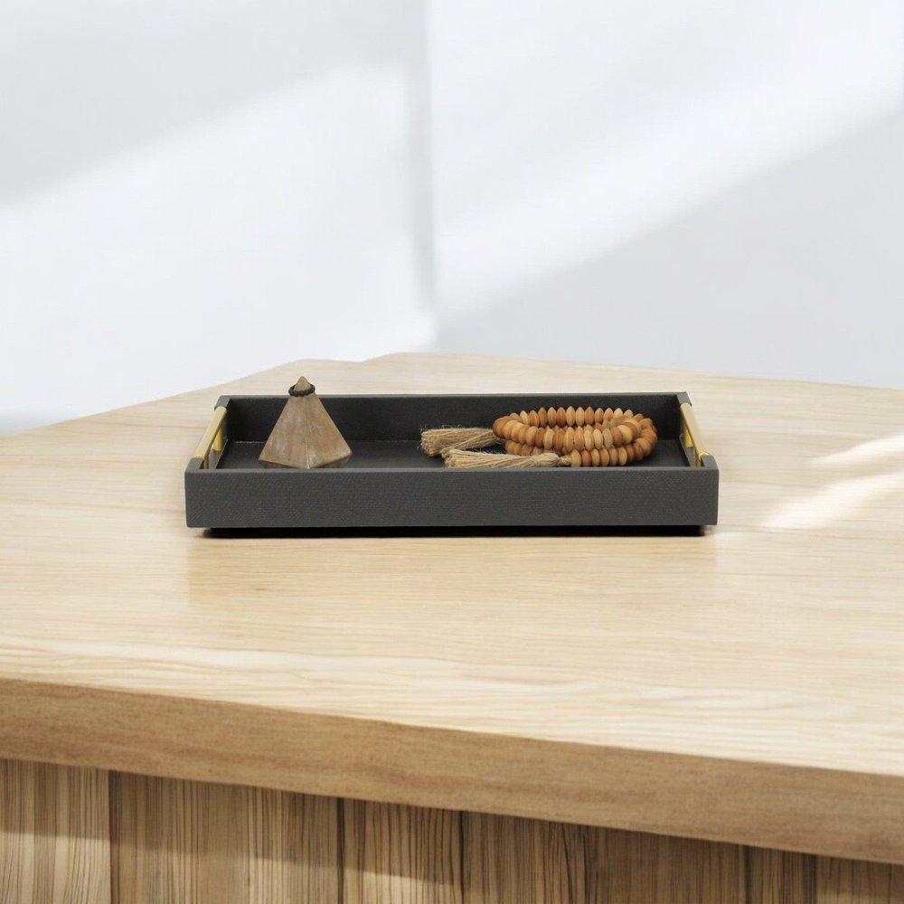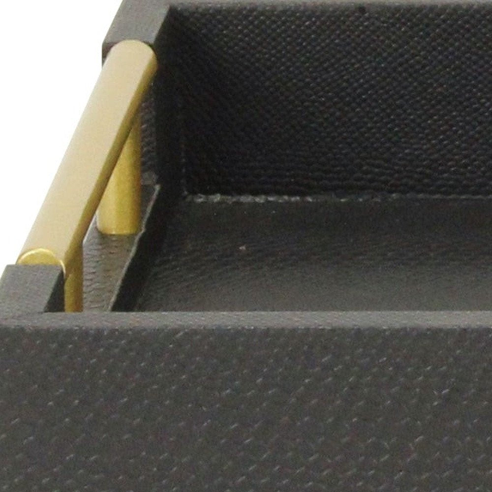 Freshen up your space with this convenient and good looking 16-inch black wood faux shagreen serving tray with handles. Finished with a vinyl faux shagreen designed pattern, this piece is not only useful but a great decorative accent as well. Features gold finished side level handles that are helpful for quick and easy transportation, and also convenient for stacking during storage. A perfect tray for serving, or displaying a collection of candles, perfume, décor, and more. 1.75-inch H x 15.75-inch W x 9.5-inch D