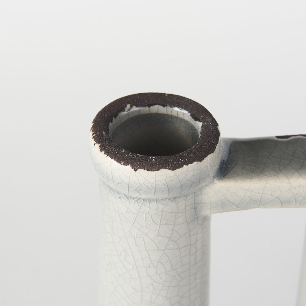 Add a touch of modern elegance to your space with this 16-inch gray and off white ceramic tall jug vase. The sleek tall jug shape and neutral color combination make it a perfect accent piece for any room. Crafted from high-quality ceramic, this vase features a mix of matte and crackle finishes with a unique shape that exudes a contemporary vibe to elevate your home. Embrace a modern rustic aesthetic with this versatile piece. 15.75-inch H x 6.3-inch W x 6.3-inch D