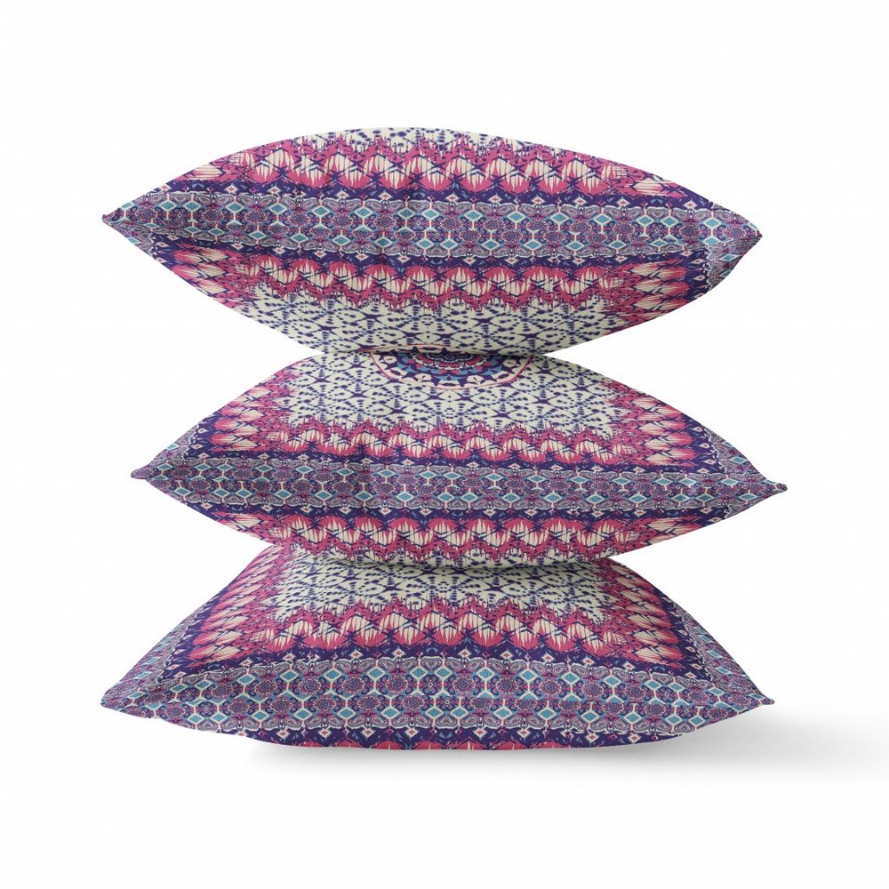 Add a lovely pop of colors to your living space with this Magenta Indigo Holy Floral Indoor Outdoor Throw Pillow that features alluring design patterns to draw the attention of the guests. The prominent geometric shapes are brimming with intricate floral patterns in cool-toned magenta, indigo, and beige that look spectacular with a bohemian flair. Crafted from top-notch broadcloth fabric, this pillow feels super soft and ensures long-lasting durability. It comes with a premium-quality polyfill insert that makes the pillow cozy and cuddly with a fluffy nature, making it a suitable accent for indoor and outdoor settings. Accentuate the elegance of your home by pairing this boho-chic decorative pillow with a soft-toned sofa or couch. 16” x 16” x 5”