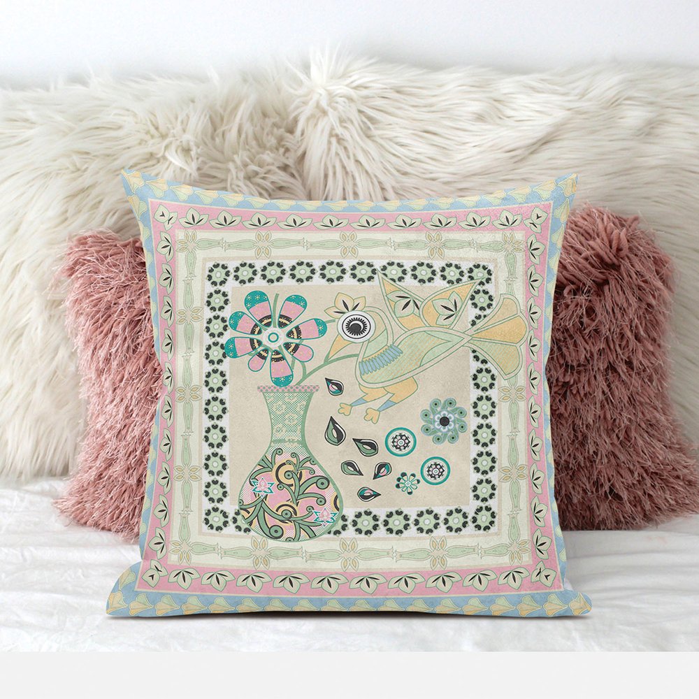 16" x 16" Blue and Beige Peacock Blown Seam Floral Indoor Outdoor Throw Pillow