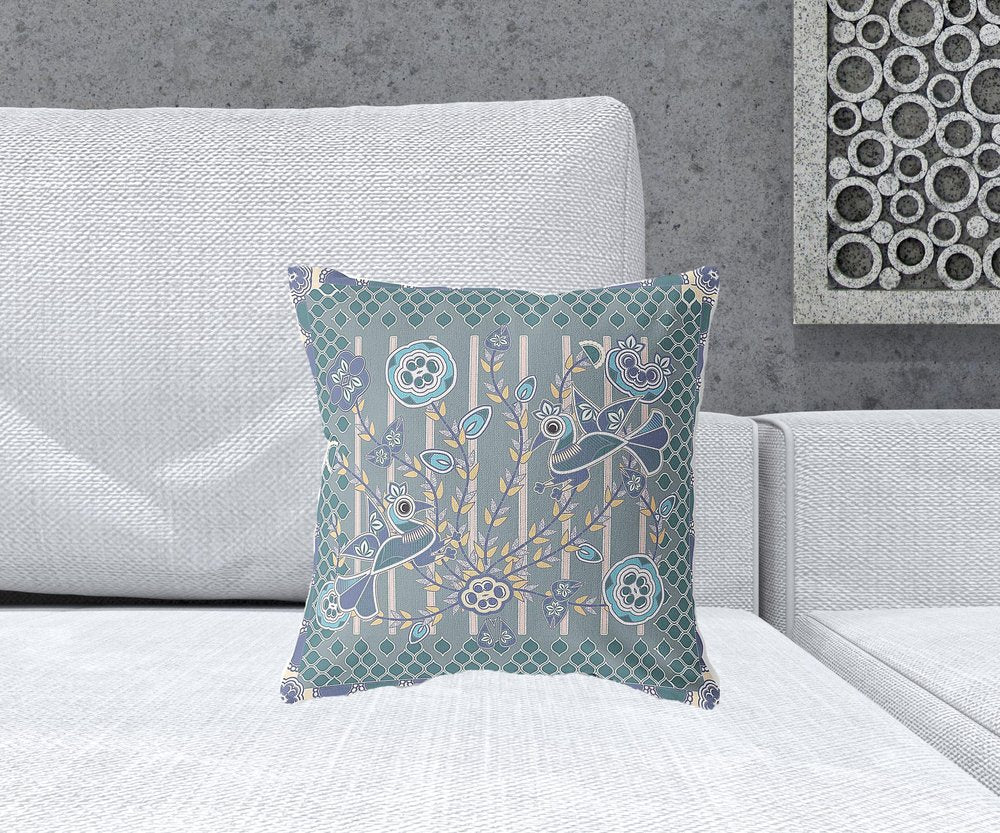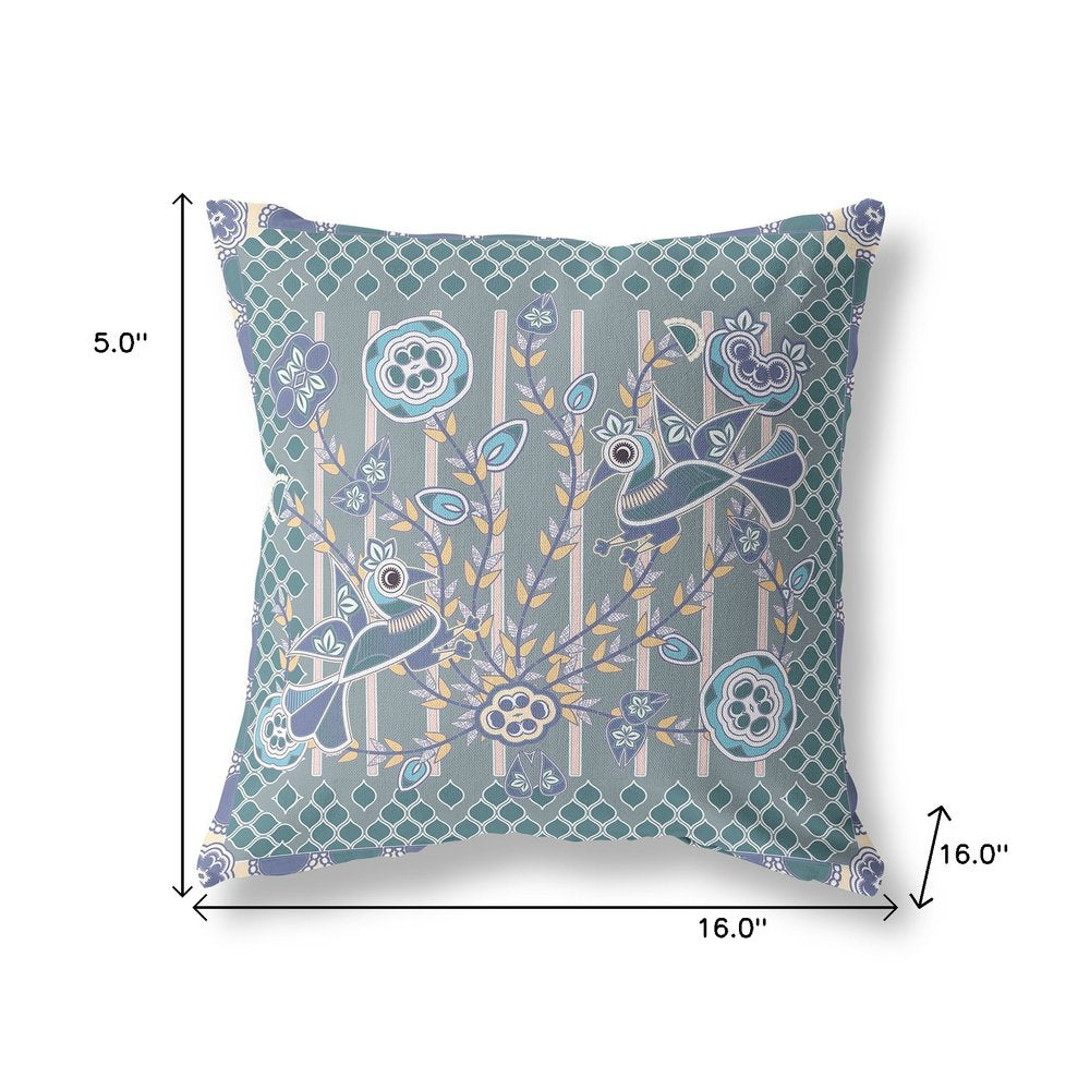 16" x 16" Blue and Gray Bird Blown Seam Floral Indoor Outdoor Throw Pillow