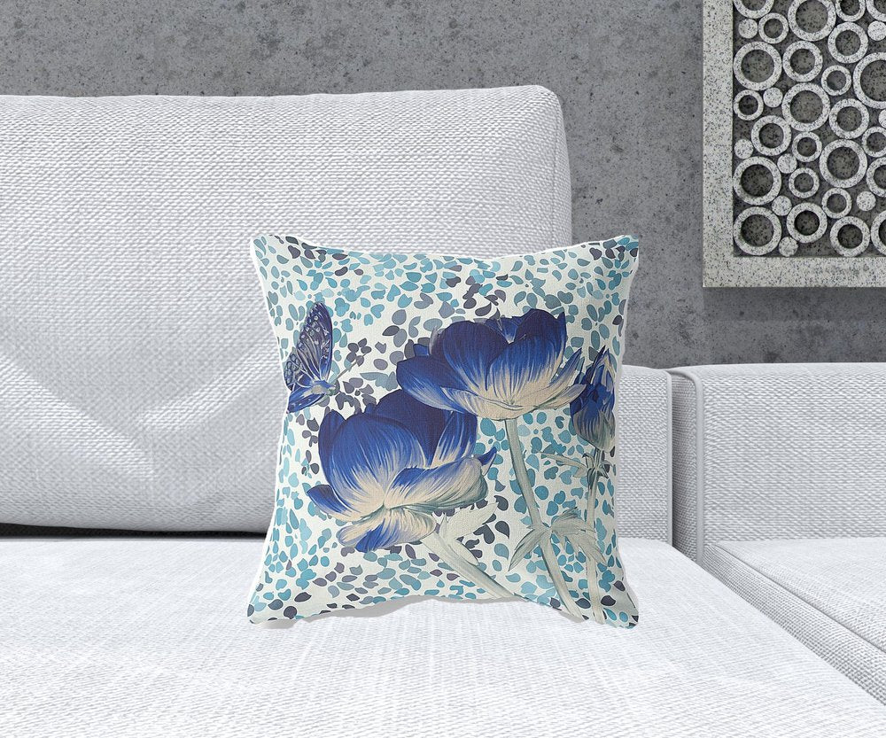 16" x 16" Blue and White Butterfly Blown Seam Floral Indoor Outdoor Throw Pillow