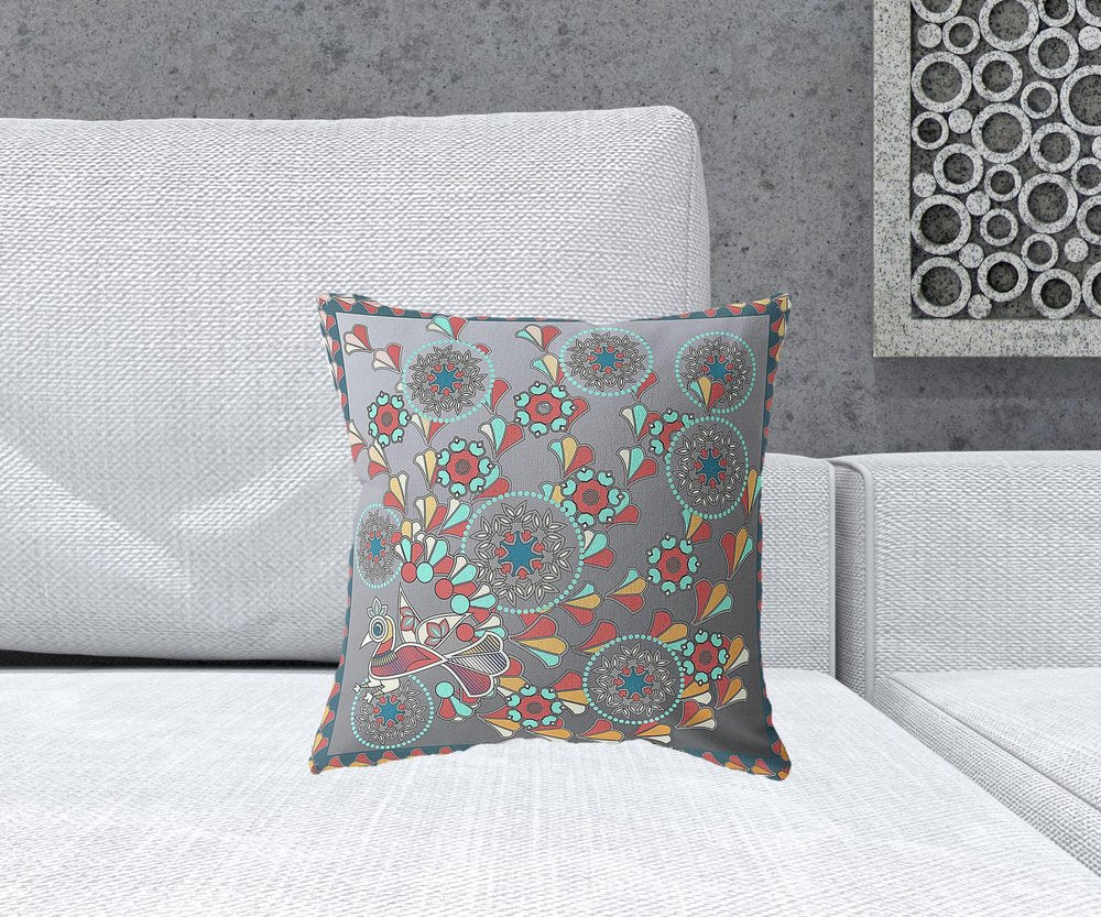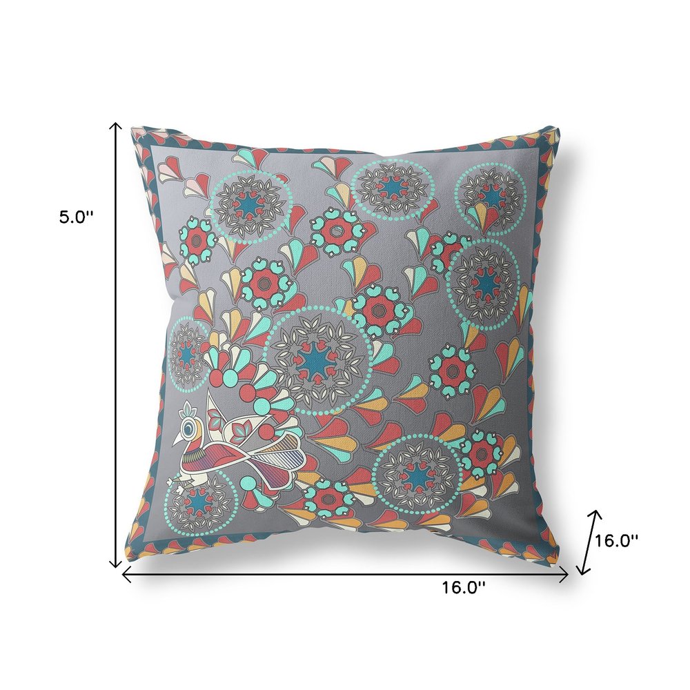 16" x 16" Gray Peacock Blown Seam Floral Indoor Outdoor Throw Pillow