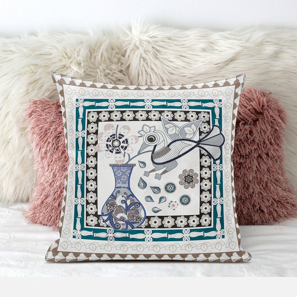 16" x 16" Off White Peacock Blown Seam Floral Indoor Outdoor Throw Pillow