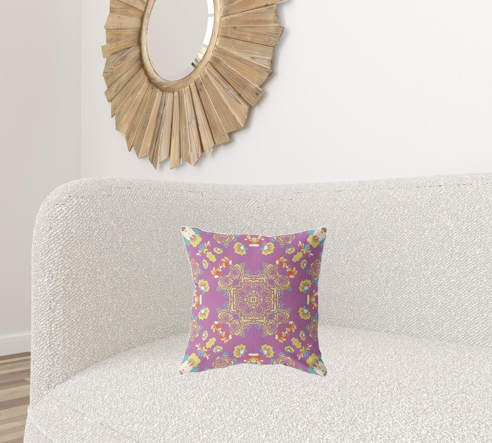 16" X 16" Purple And Yellow Broadcloth Floral Throw Pillow