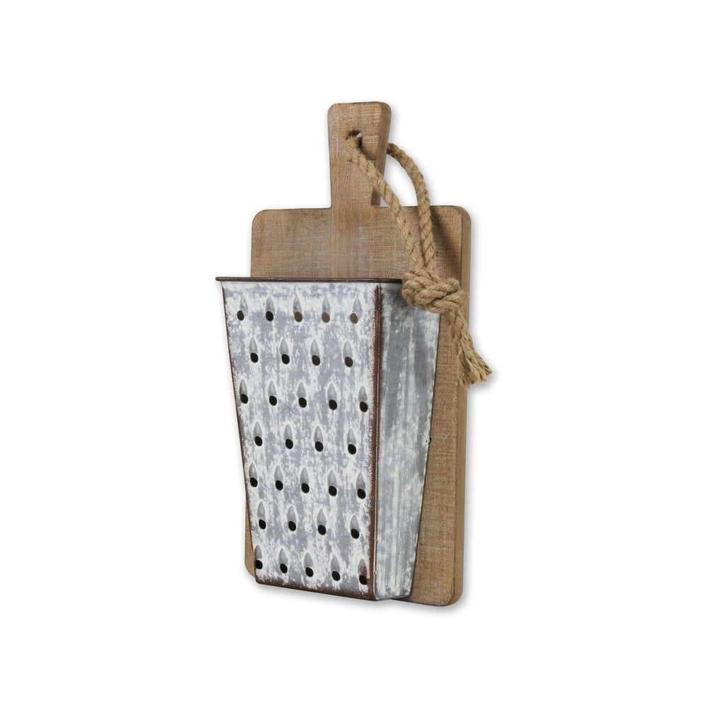 This 16-inch x 9-inch gray and brown wood and metal hanging dimensional sculpture will add a beautiful and rustic decorative accent to your walls. Handmade with care, this vintage style cheese grater is mounted on a cutting board to create authentic and artisanal dimensional art for your kitchen or dining room. With materials and a finish that is purposefully distressed, this hanging wall decor will instantly liven things up and bring some unique style and dimension to your walls. 15.75-inch h x 8.5-inch w x 3.5-inch d.