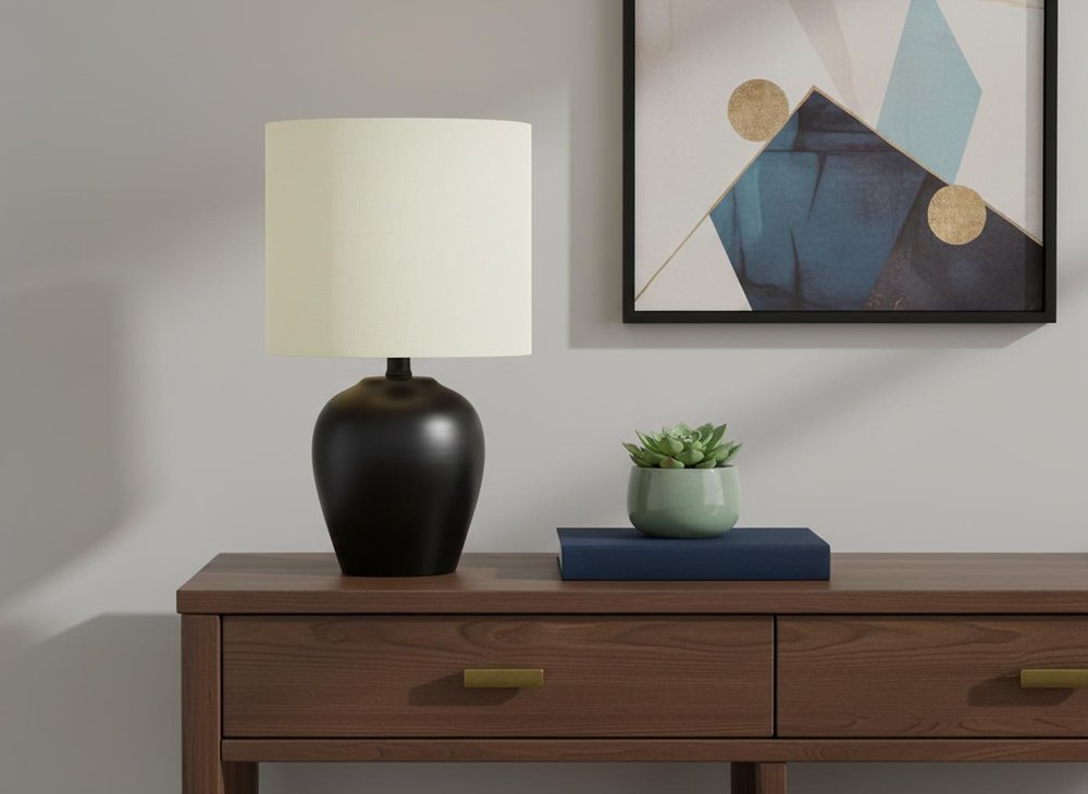 This 17-inch black ceramic round table lamp with ivory drum shade is a great way to add some brightness to any corner of your home. A gorgeous black ceramic base brings just the right amount of pizzazz to this fabulous lamp. The ivory shade has a drum shape and is made of fabric, which makes it a perfect choice. This standard table lamp is designed to provide general lighting to the area. High quality design makes this a great lamp for not only lighting, but accenting a room with style. It is perfect for virtually any decor. 16.5-inch H x 9.5-inch W x 9.5-inch D