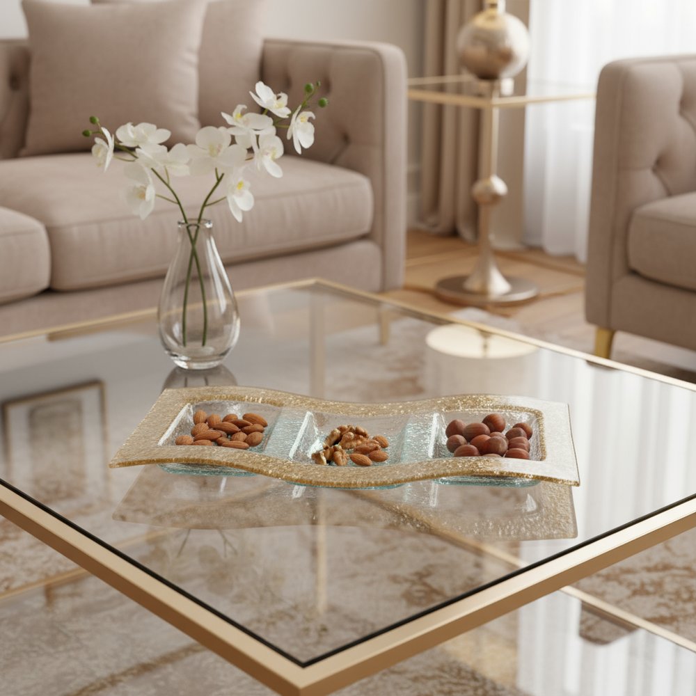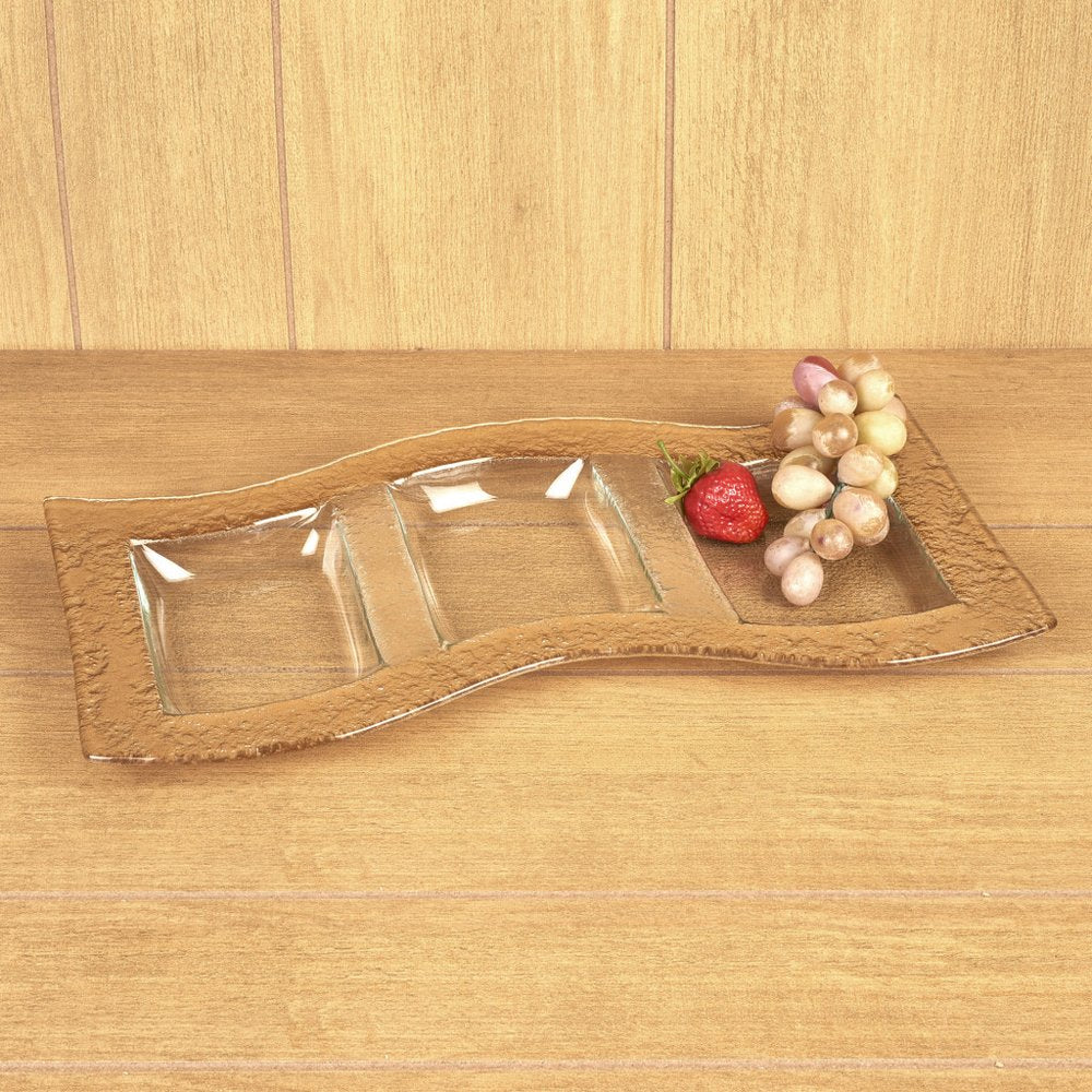 This 17" clear and gold rectangular glass handmade divided serving dish is perfect for all your dinner party or holiday hosting needs. Beautiful and durable, this glass rectangular divided serving dish is both the perfect gift and a glittering addition to your décor. Intended for decorative, non-food use only, it's the perfect decorative accent piece. 1" H x 17" W x 7.5" D