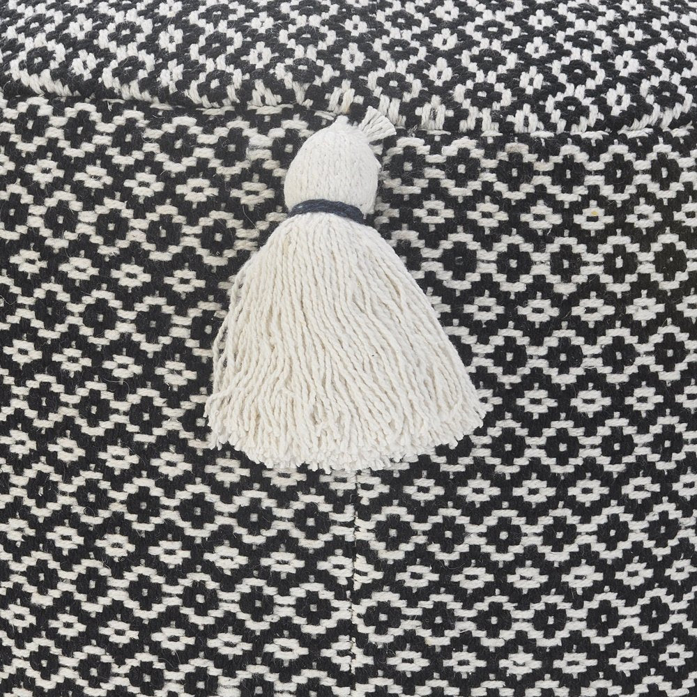 Practicality and fashion mix together with this handy 18-inch black cotton cylinder geometric pouf ottoman. Add chic style to your space with this fun pouf that not only looks cool but can be a great foot rest or extra seat when needed. Expertly upholstered with padding and soft 100% cotton in a geometric pattern, this ottoman is as comfortable as it is good looking. Easy to blend into most any room, a ottoman is a way to add a good looking accent to your space that can also be practical and useful. 14-inch h x 18-inch w x 18-inch d.