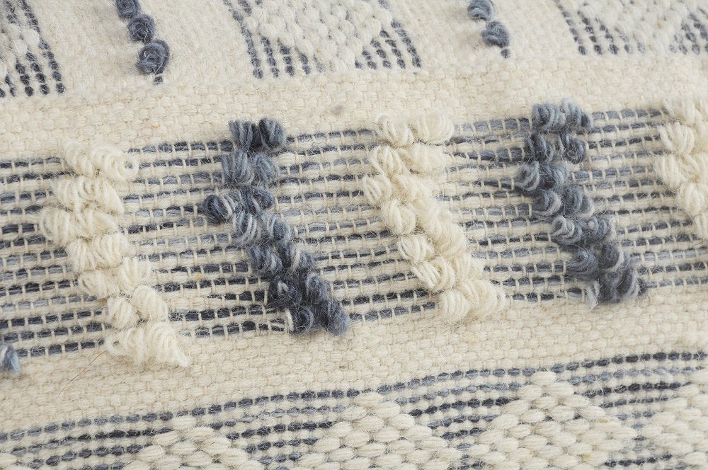Practicality and fashion mix together with this handy 18-inch blue striped pouf ottoman. Add chic style to your space with this fun pouf that not only looks cool but can be a great foot rest or extra seat when needed. Expertly upholstered with padding and soft wool in a striped pattern, this ottoman is as comfortable as it is good looking. Easy to blend into most any room, a ottoman is a way to add a good looking accent to your space that can also be practical and useful. 14-inch h x 18-inch w x 18-inch d.