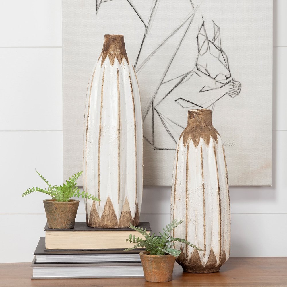 Add a touch of modern elegance to your space with this 18-inch abstract cylinder ceramic vase. Its sleek cylinder shape and brown and white abstract design make it a stylish choice for any room. Made from high-quality ceramic, this vase is both durable and eye-catching. Perfect for displaying on a table or shelf, this vase will effortlessly enhance your home decor with its contemporary charm. 18-inch h x 6-inch w x 6-inch d.