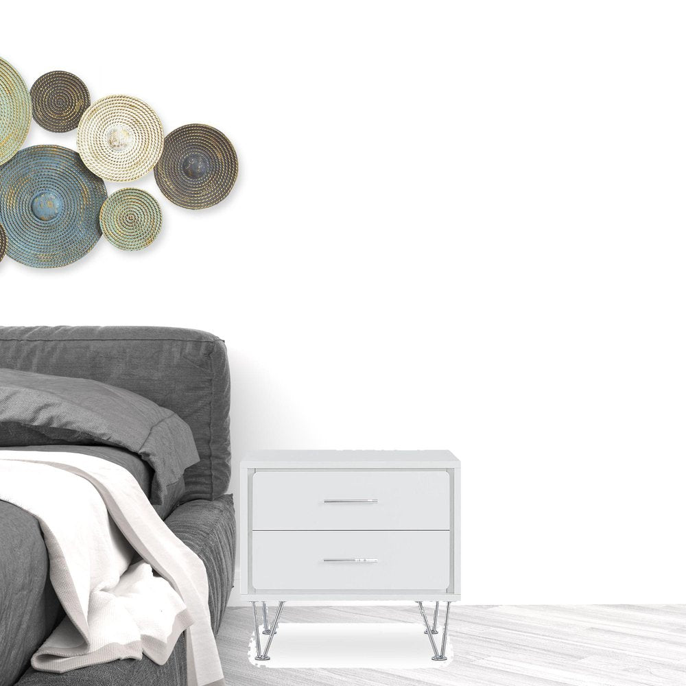 Our 18" brown two drawers metal nightstand will compliment your bed beautifully. The piece has 2 drawers to store your bedtime essentials close to you as you rest. The unsung hero of the bedroom, this nightstand is perfect for keeping a glass of water, lamp, alarm clock, jewelry and more, close by and easily accessible. Versatile in use this nightstand would also work as a great end table in the living room, hallway, or office. 17.93" H x 19.69" W x 15.75" D