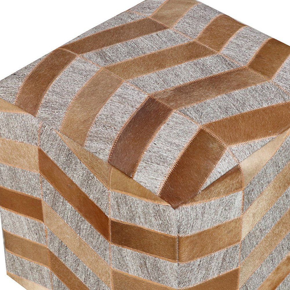 18" Gray and Bronze Hair on Hide Cube Chevron Pouf Ottoman