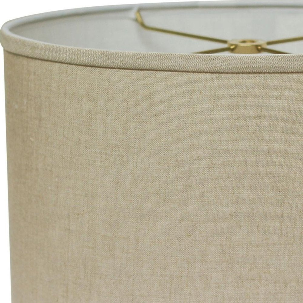 The beige linen oval lamp shade effortlessly enhances your living space with its elegant design. Crafted from high-quality linen, it exudes a soft, inviting texture that complements various decor styles. The charming mid-century style adds a touch of vintage flair while maintaining a modern appeal. Its oval shape provides a unique silhouette, creating a warm ambiance when illuminated. Designed with a spider attachment type, this lampshade is easy to install on most lamp bases, making it a convenient choice for your home. Transform your lighting experience by incorporating this beautifully crafted lampshade into your interior design scheme, bringing both functionality and aesthetic value to your favorite rooms. 11.00-inch h x 18.00-inch w x 12.00-inch d.