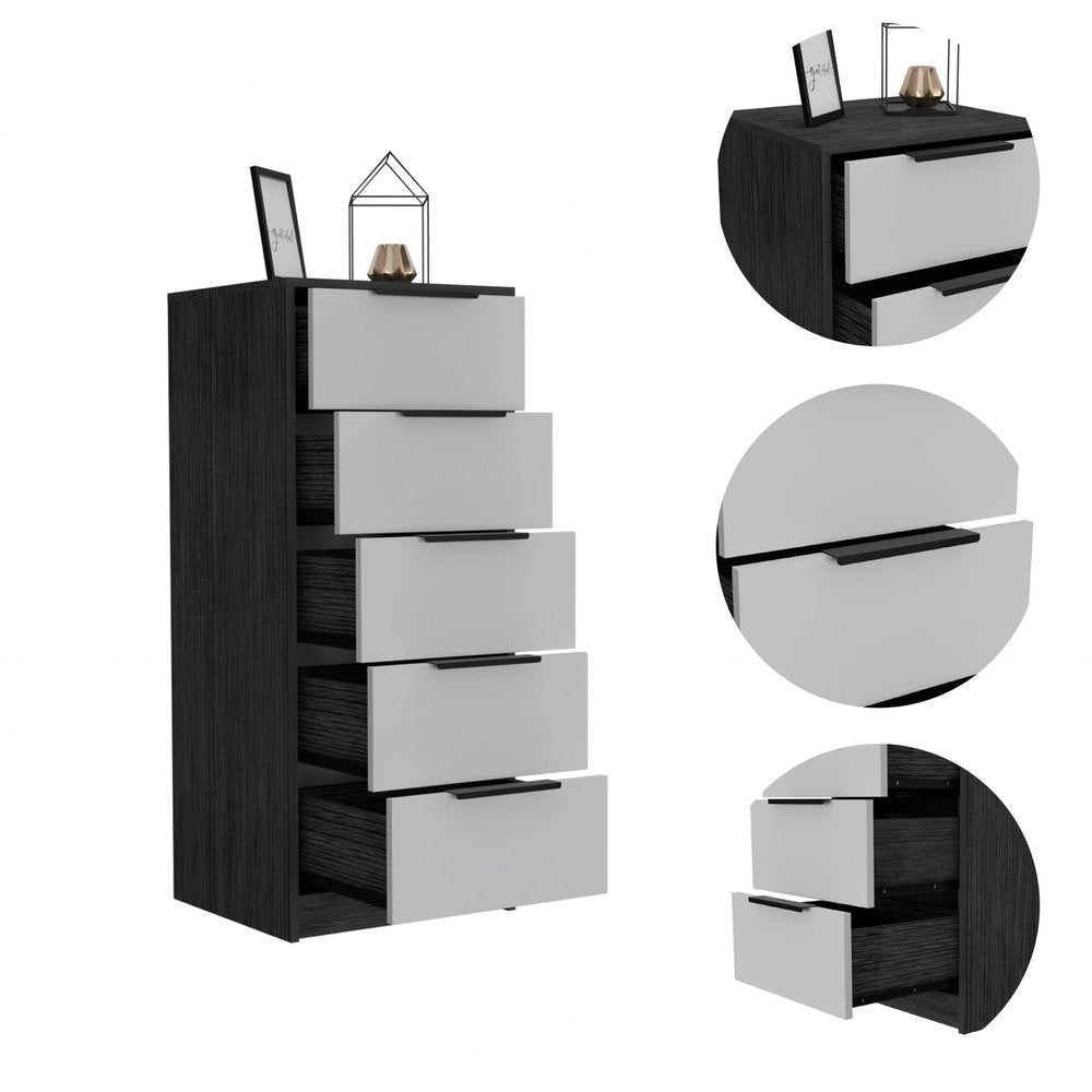 Enhance your room into a visually delightful and highly functional space with this 18" white manufactured wood five drawer standard chest. This chest of drawers is tall and lean making it an ideal choice for smaller rooms or as an additional storage option in larger rooms. Equipped with five easy open drawers for practical and good looking clothing storage. Its a high quality piece, made from high grade manufactured wood. The white coloration of this piece is neutral and will blend easily with most any decor. 42.4" H x 17.7" W x 16.3" D