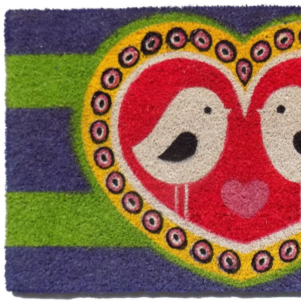 Known for it's extreme durability and ability to withstand heavy foot traffic, this 18-inch x 30-inch red and green coir heart outdoor door mat is an ideal option for the front door or entrance way of your home or business. Crafted from coconut husks, this mat is not only functional but is an an eco-friendly and visually appealing accessory. The naturally bristled texture of coir is an efficient way to clean dirt and mud from shoes and is easy to clean and maintain. Add this decorative mat to create a practical yet inviting welcome to all who enter. 18-inch H x 30-inch W x 0.5-inch D