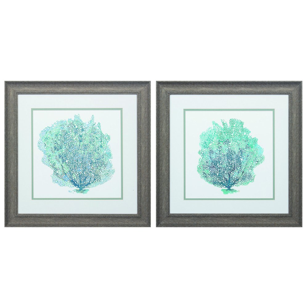 19" X 19" Distressed Wood Toned Frame Teal Coral On White (Set Of 2)