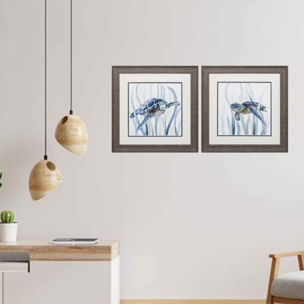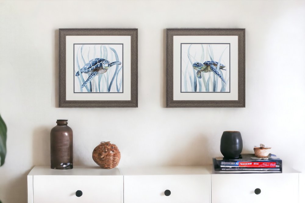 19" X 19" Distressed Wood Toned Frame Turtle In Grass (Set Of 2)