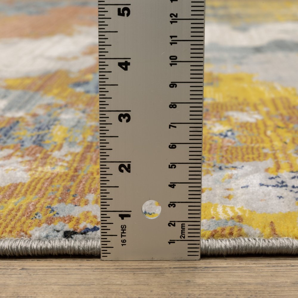 This 2' x 8' yellow gold blue grey brown and beige abstract power loom stain resistant runner rug, is a great way to add warmth to a room. This runner shaped rug features a abstract design in yellow gold blue grey brown and beige to give it visual interest. A classic shape marries with good looking design for your space Ideal for spaces with kids and pets, this rug is stain resistant to help repel stains and spilled liquids. Place this area rug against a hardwood or tile floor and it will enliven your living space with style and sophistication. 0.31" H x 26.77" W x 92.52" D